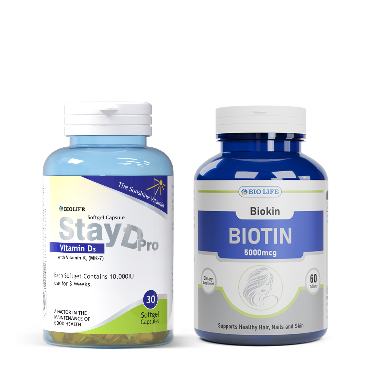 Biokin by Bio Life is a high-strength Biotin supplement (5000mcg) designed to support the health and vitality of your hair, skin, and nails. Ideal for those facing hair thinning, brittle nails, or dull skin, Biokin provides essential B-vitamin support from within.