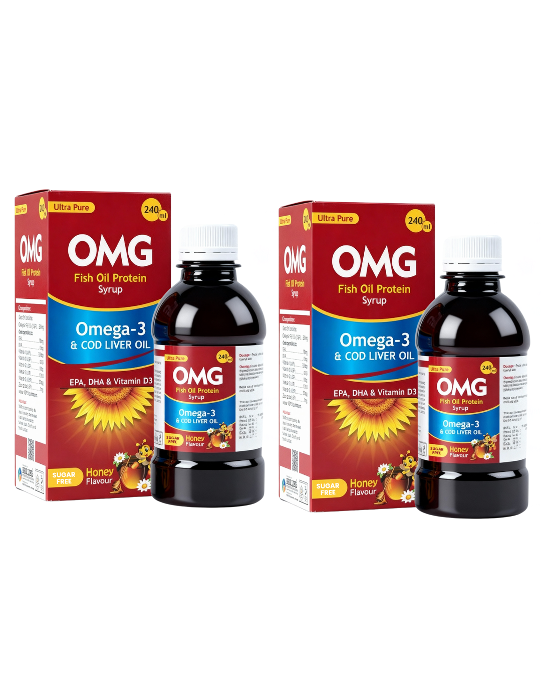 OMG Fish Oil Protein Syrup is a premium nutritional supplement that combines Omega-3 Fish Oil and Cod Liver Oil with essential vitamins and minerals to support daily wellness. Enriched with EPA, DHA, Vitamins A, D3, C, E, K2 and Zinc, it helps maintain a healthy heart and brain, supports strong bones and flexible joints, and promotes clear skin and eye health.